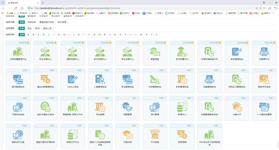 第三步:点击“应用中心”,默认显示收藏的系统,点击业务系统,即可显示学校所有业务系统,核心业务系统都已做过统一身份认证,不用重新输入密码,即可进入不同的业务系统,其他系统还在完善中。