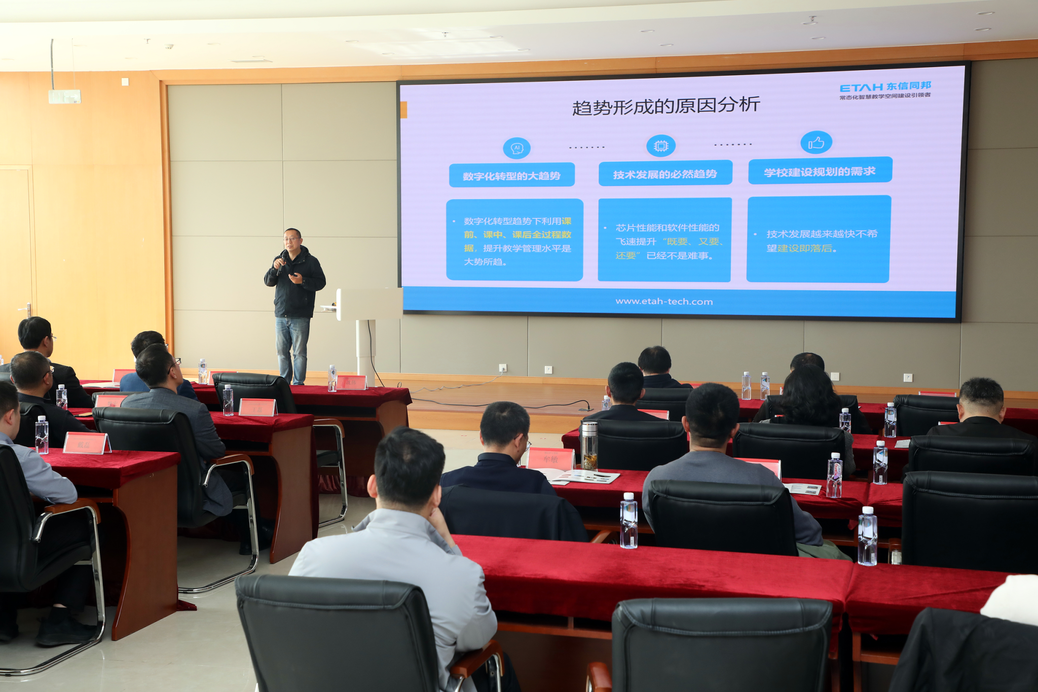 东信同邦董事长沈振冈也在会上带来了前沿资讯。他介绍了公司在助力智慧教学方面的技术更新和最新产品,展示了公司在人工智能、大数据等前沿技术与教学场景融合方面的最新成果。这些创新成果为学校的智慧教学建设提供了更多的技术支持和解决方案,为推动教学智能化发展注入了新的活力。