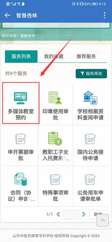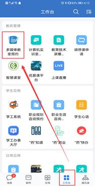 第一步:单击企业微信——工作台,找到“多媒体教室预约”。