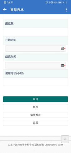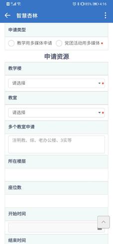 第二步:在“申请类型”中选择“教学用多媒体”或“党团活动”。填写需要预约的楼宇、教室编号和起止时间,然后点击“提交”按钮,然后等负责人审核通过即可。