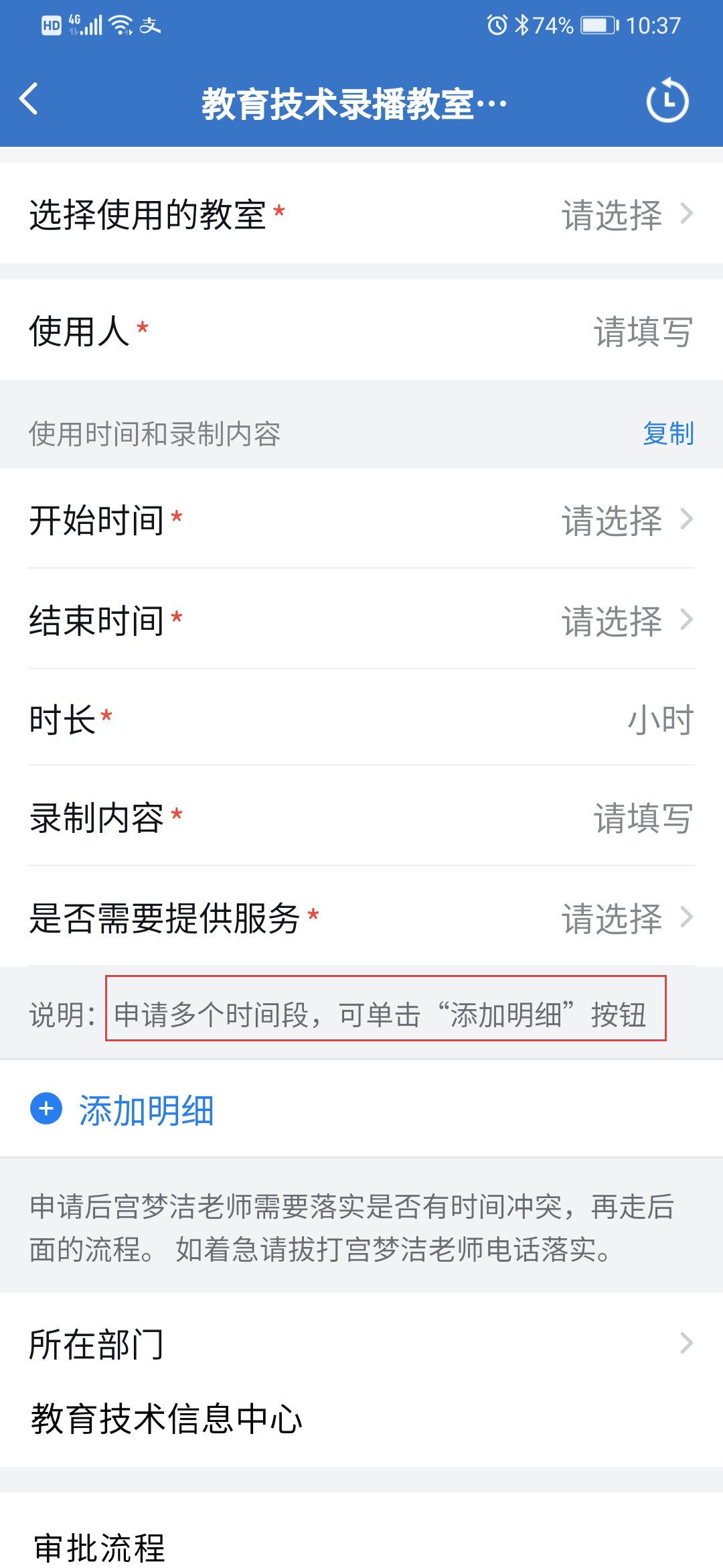 第二步:根据需求,选择使用的教室类型,填写使用人姓名,开始时间和结束时间(正常上班时间),填写录制内容。然后点击“提交”按钮,然后等负责人审核通过即可。