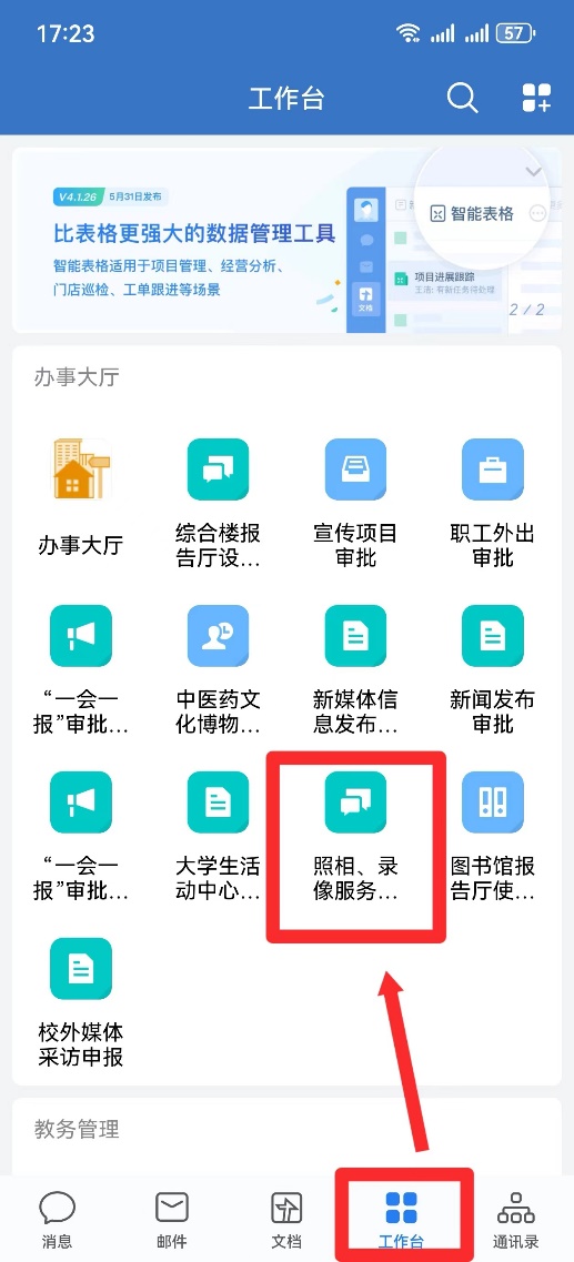 第一步:单击企业微信——工作台,找到“照相、录像服务申请”。