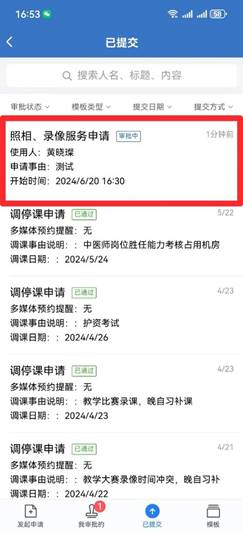 在申请前需要先确定需要照相还是录像,并通过电话或企业微信联系黄晓璨老师,落实工作人员是否有时间冲突(尽量提前沟通)。