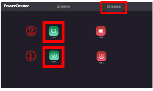 1.找到讲台大屏左侧的多功能控制面板,打开多功能控制面板,进入设备控制,按一下“电源开”,开启教室电源,等待3分钟。